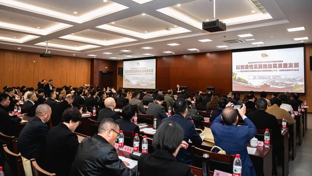 张天任董事长授课主题是《以创造性实践推动高质量发展》。他表示,习近平新时代中国特色社会主义思想、党的二十大、全国两会都贯穿着“高质量发展”这条主线。他结合浙江高质量发展的实践,jcjc5500公海高质量发展的历程,从十二个方面对“以创造性实践推动高质量发展”进行全面解读。
